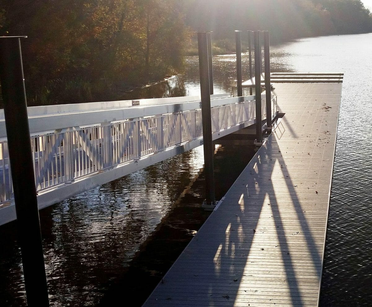 In anticipation of potential water fluctuations, the use of hoop roller brackets to attach the massive floating dock to new steel pilings is a testament to AccuDock’s attention to detail. A transition plate and additional hand railings on the gangway enhance safety and provide easy access for up to two coxed 8’s at a time. This project is a reflection of our dedication to creating tailor-made solutions for rowing facilities.